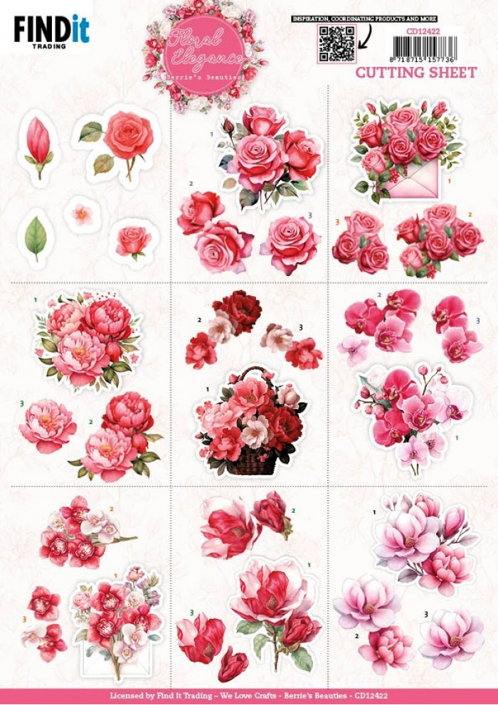 Knipvel met diverse mini 3D-afbeeldingen in het thema van de collectie Floral Elegance van Berries Beauties.